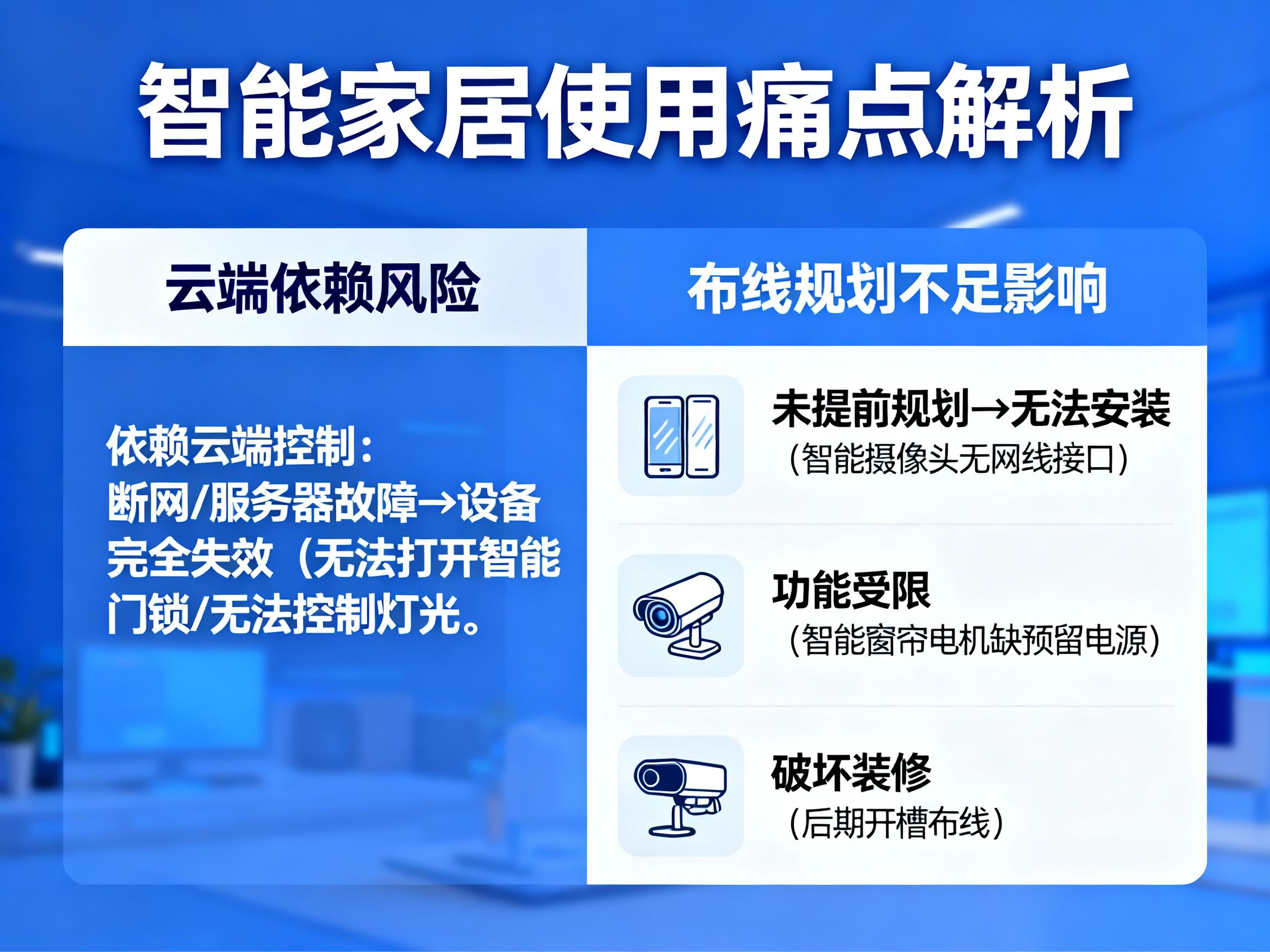 - 应对方法:装修初期让智能家居服务商与装修公司对接,出具详细布线方案;重点预留点位包括:各房间网线接口(支持有线连接的设备更稳定)、窗帘盒内电源插座、智能马桶旁防水电源、安防设备安装位置的电源线和网线;在不确定的位置预留备用插座和网线接口,避免后期需求变更无法满足。
