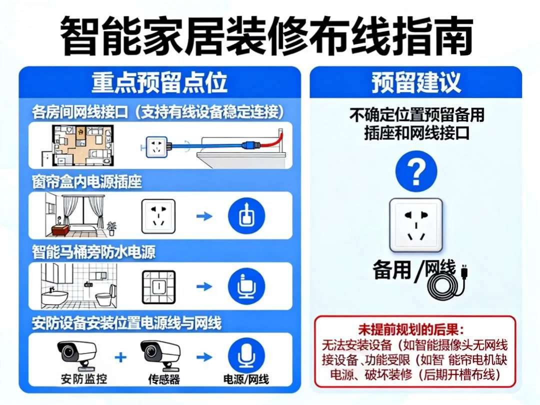 - 应对方法:装修初期让智能家居服务商与装修公司对接,出具详细布线方案;重点预留点位包括:各房间网线接口(支持有线连接的设备更稳定)、窗帘盒内电源插座、智能马桶旁防水电源、安防设备安装位置的电源线和网线;在不确定的位置预留备用插座和网线接口,避免后期需求变更无法满足。