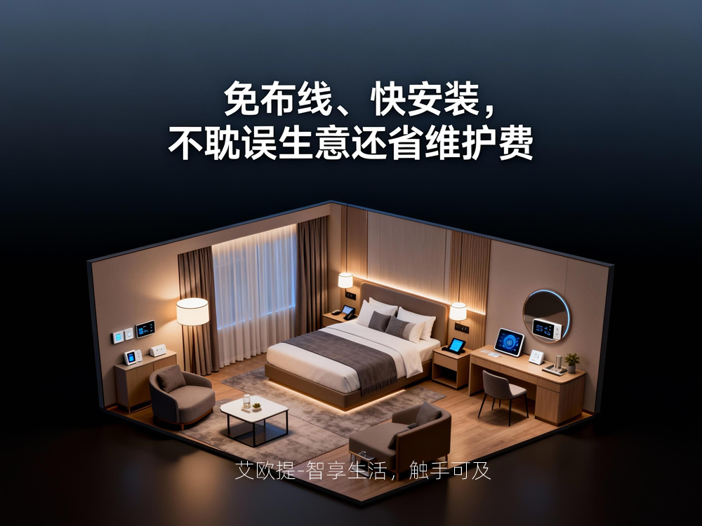 传统智能客控系统的安装,往往需要凿墙布线、改造电路,不仅施工周期长(动辄半个月),还会影响正常营业,额外增加停工损失。更麻烦的是,后期线路出问题,检修起来又费钱又费力,对中小酒店来说是 “双重消耗”。