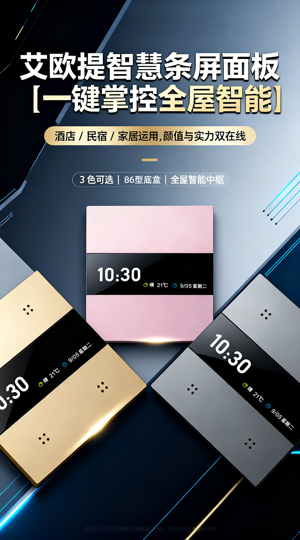 A:细节直接拉满!它能实时显示天气,出门前扫一眼面板,要不要带伞、穿什么厚度的衣服,心里一目了然;采用 86 型标准尺寸,直接替换家里的旧开关,不用改线路,新房装修、老房改造都能直接用;还有 3 种配色可选(玫瑰金、香槟金、深空灰),轻奢风、简约风、商务风都能适配,颜值和实用性双在线。